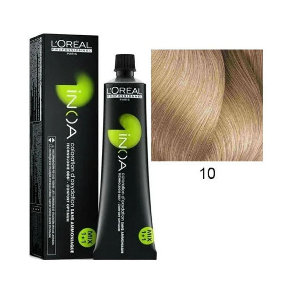 لوريال بروفيشنال صبغة الشعر إنوا 10 (60 جم) تمنحك لون أشقر فاتح جداً طبيعي يدوم طويلاً، مما توفر عناية فائقة للشعر وفروة الرأس مع نتائج مذهلة ولمعان طبيعي.
