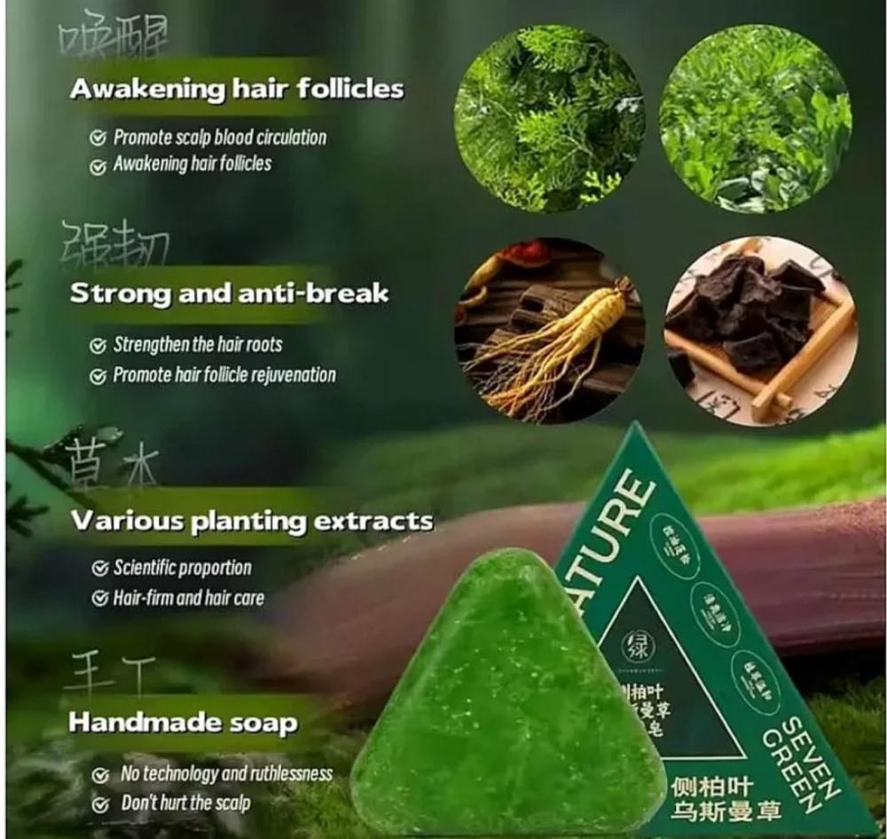 صابونة عشبية طبيعية 100٪ من Nature Seven Green، صُممت خصيصًا لتحفيز نمو الشعر وتقويته من الجذور حتى الأطراف.